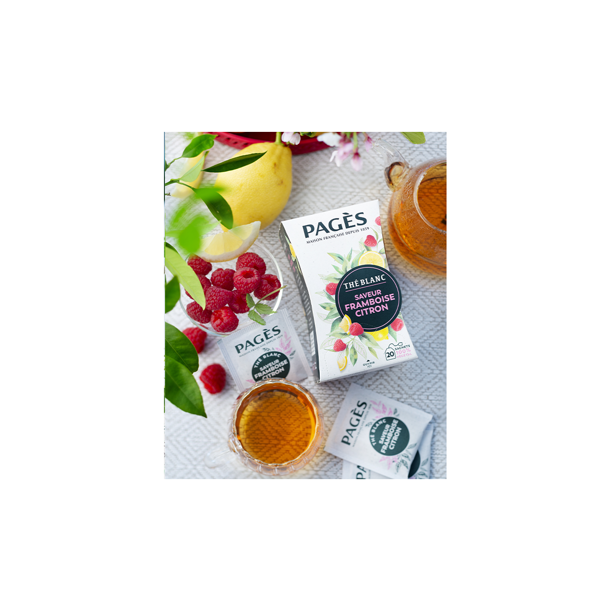 Ingrédients : Thé blanc 84%, Hibiscus rouge 5%, arôme naturel 4%, arôme naturel de Citron avec autres arômes naturels 4%, Framboise 1%, écorces de Citron 1%, Stévia 1%.