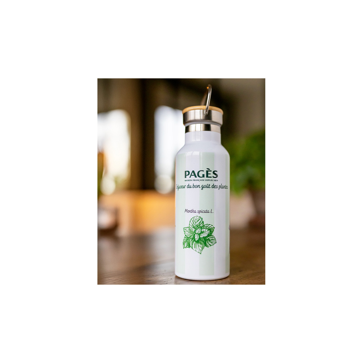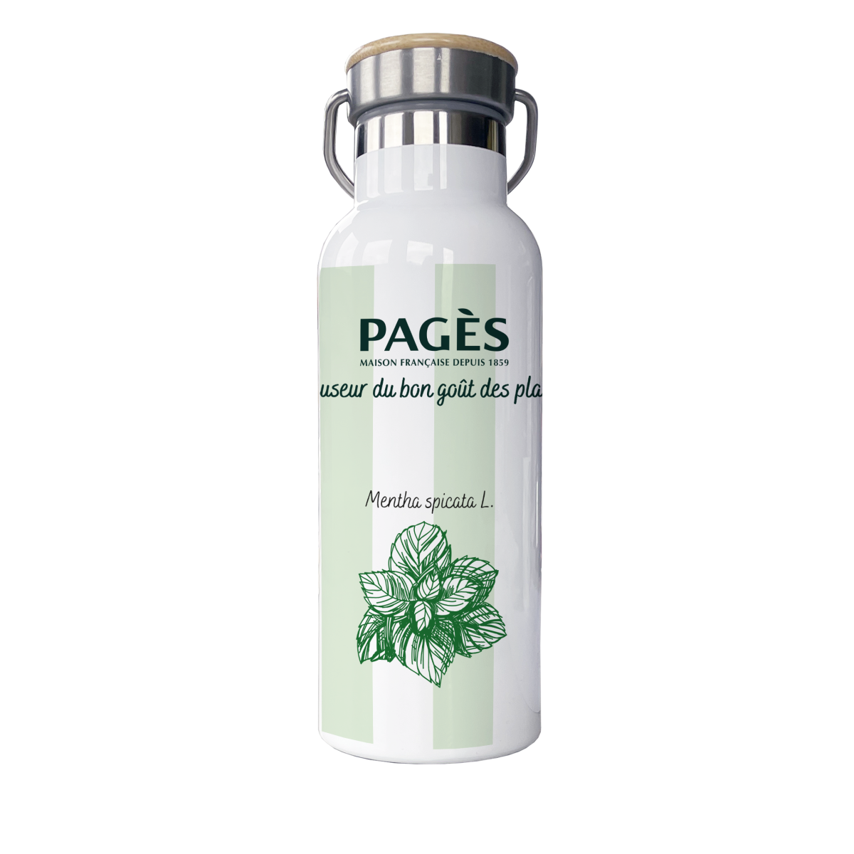 Découvrez notre nouvelle gourde Pagès, au coloris vert. Idéale pour faire suivre vos infusions et thés partout ! Cette bouteille isotherme à double paroi en acier inoxydable est équipée d’un bouchon en bambou et d’une poignée, facilitant son utilisation et transport.