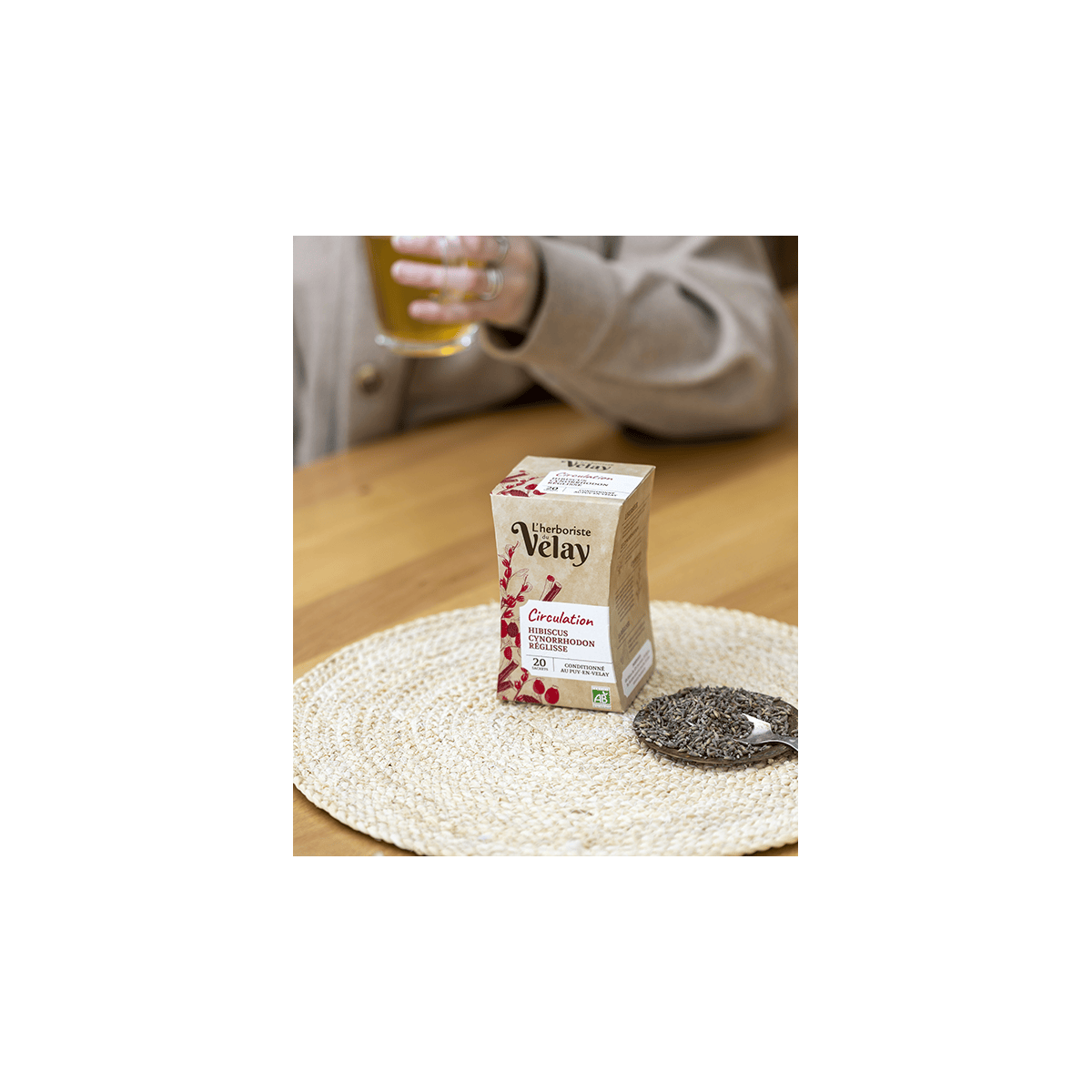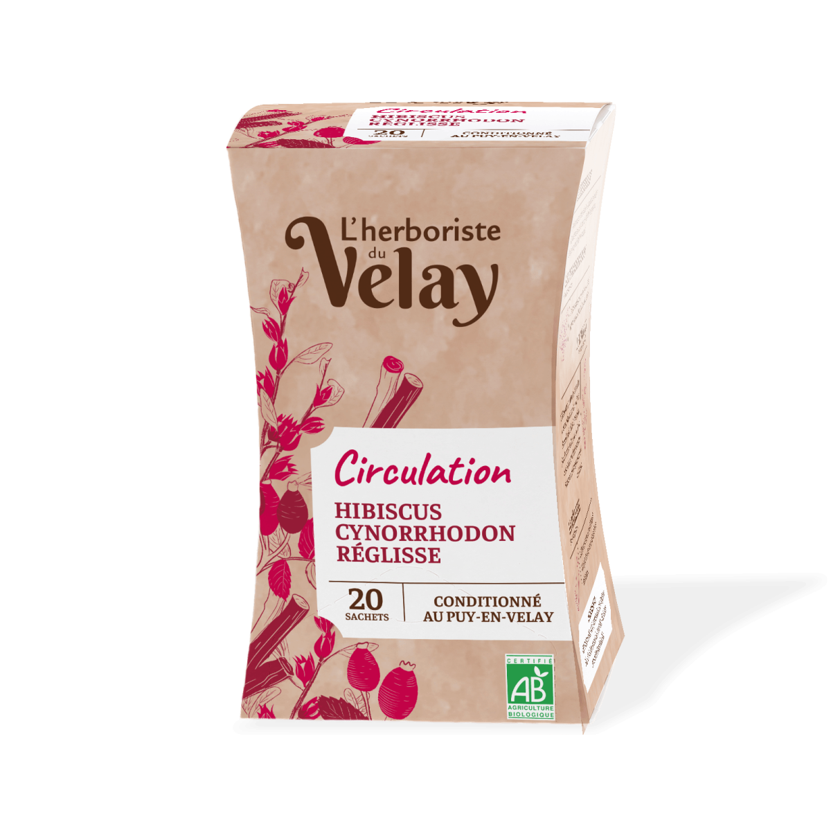 Découvrez notre infusion Circulation, un mélange de trois plantes classiques de l’herboristerie pour une infusion au goût herbacé et naturel. Le Cynorrhodon au goût légèrement acidulé apporte une note d'originalité à cette infusion. L'Hibiscus, connu pour favoriser la sensation de jambes légères est une plante originaire d'Afrique du nord. Utilisée à la base comme plante d'ornement, ses fleurs sont d'une beauté caractéristique et et son feuillage persistant, l'Hibiscus sera ensuite largement employé pour l'infusion. La Réglisse est une racine récoltée depuis l'Antiquité. Ses notes sucrées lui valent le nom de bois doux.